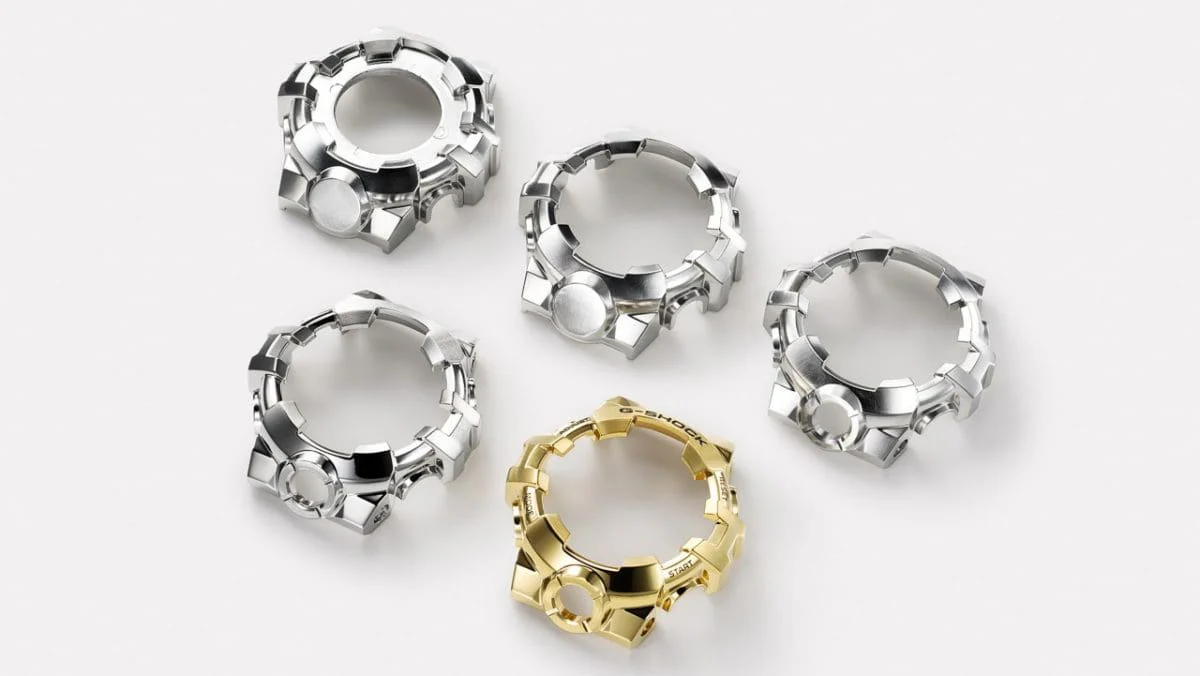 Stainless steel is used for the bezel. Its complex form, which protects glass and buttons, is crafted with meticulous processes of forging, cutting, and polishing. Separate hairline and mirror finishes are applied to individual surfaces, creating metal exteriors with color IP in a selection of hues setting off the texture of the metal with a striking look of sophistication.