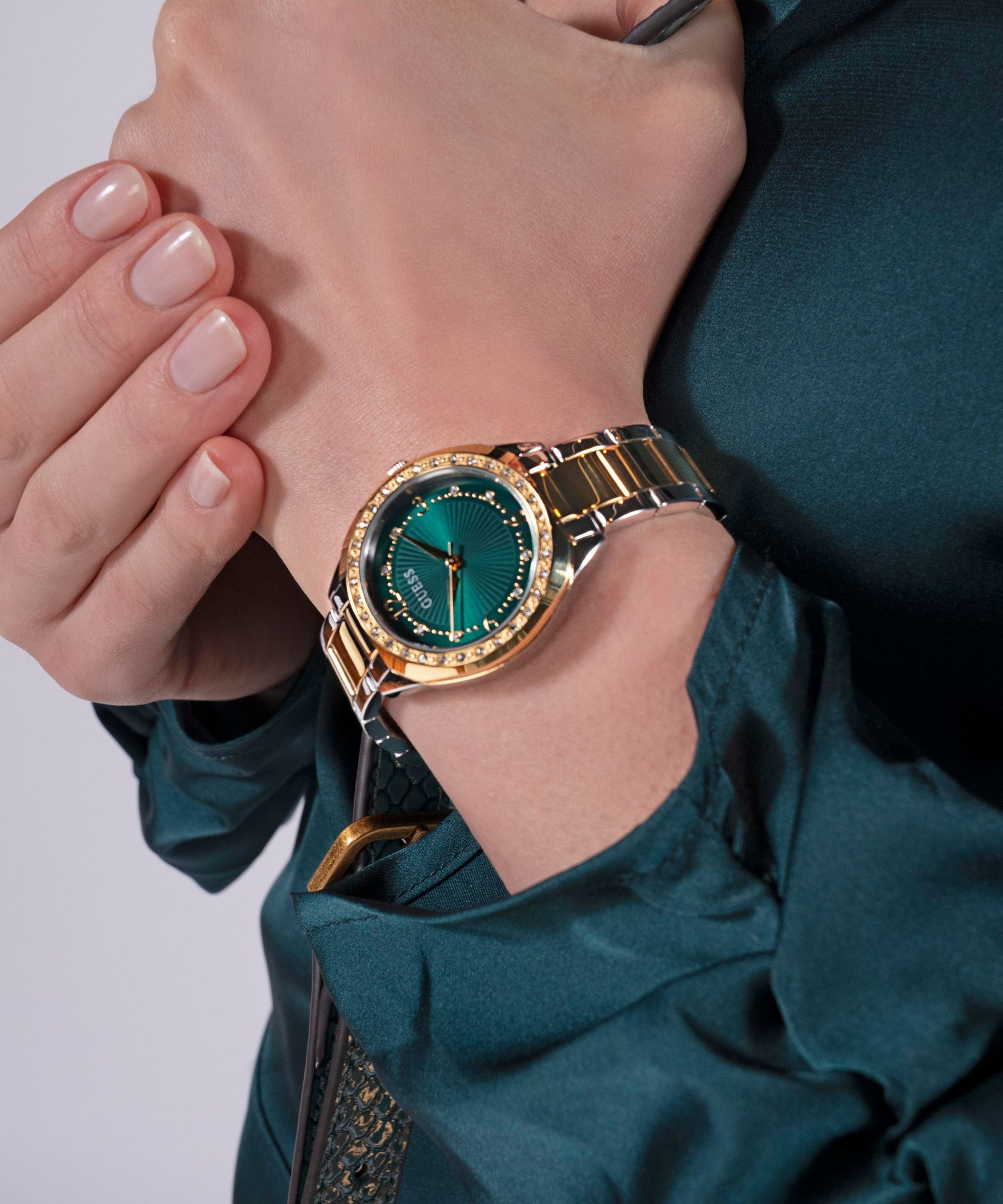Sure to be a staple in your watch wardrobe, this petite new timepiece from GUESS features a 30mm gold tone crystal enriched bezel and gold and silver two tone bracelet, perfectly complimented by a green dial and crystal indices.