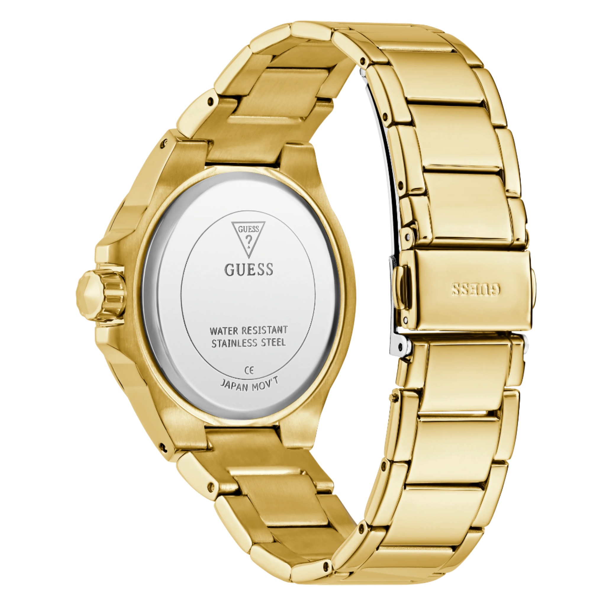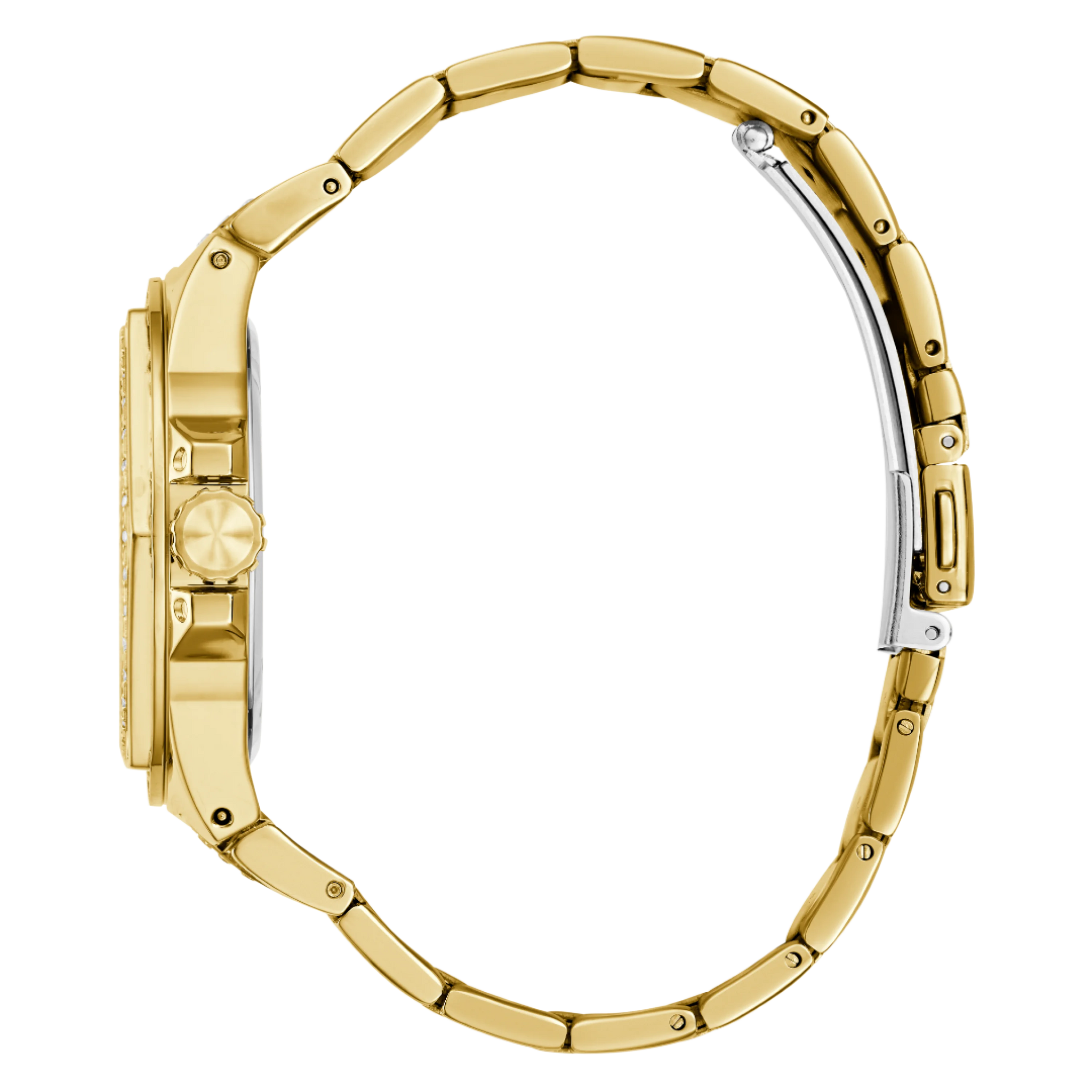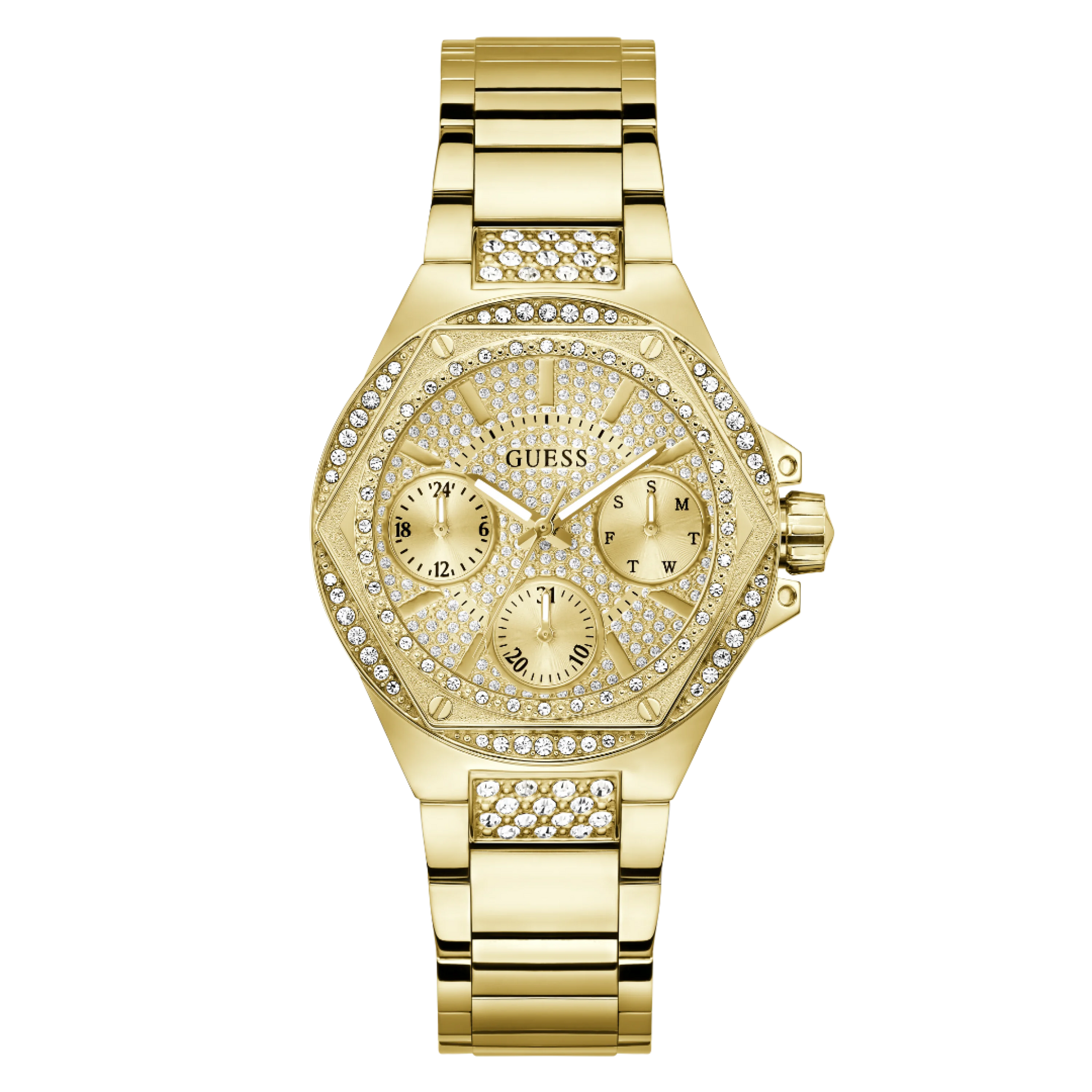 Be the envy of all with this new collection from GUESS Watches. The 38mm gold-tone case showcases distinctive angular details on the crystal-adorned bezel, while the dazzling multi-function champagne dial is paired with a polished gold-tone bracelet, also enhanced with crystals.