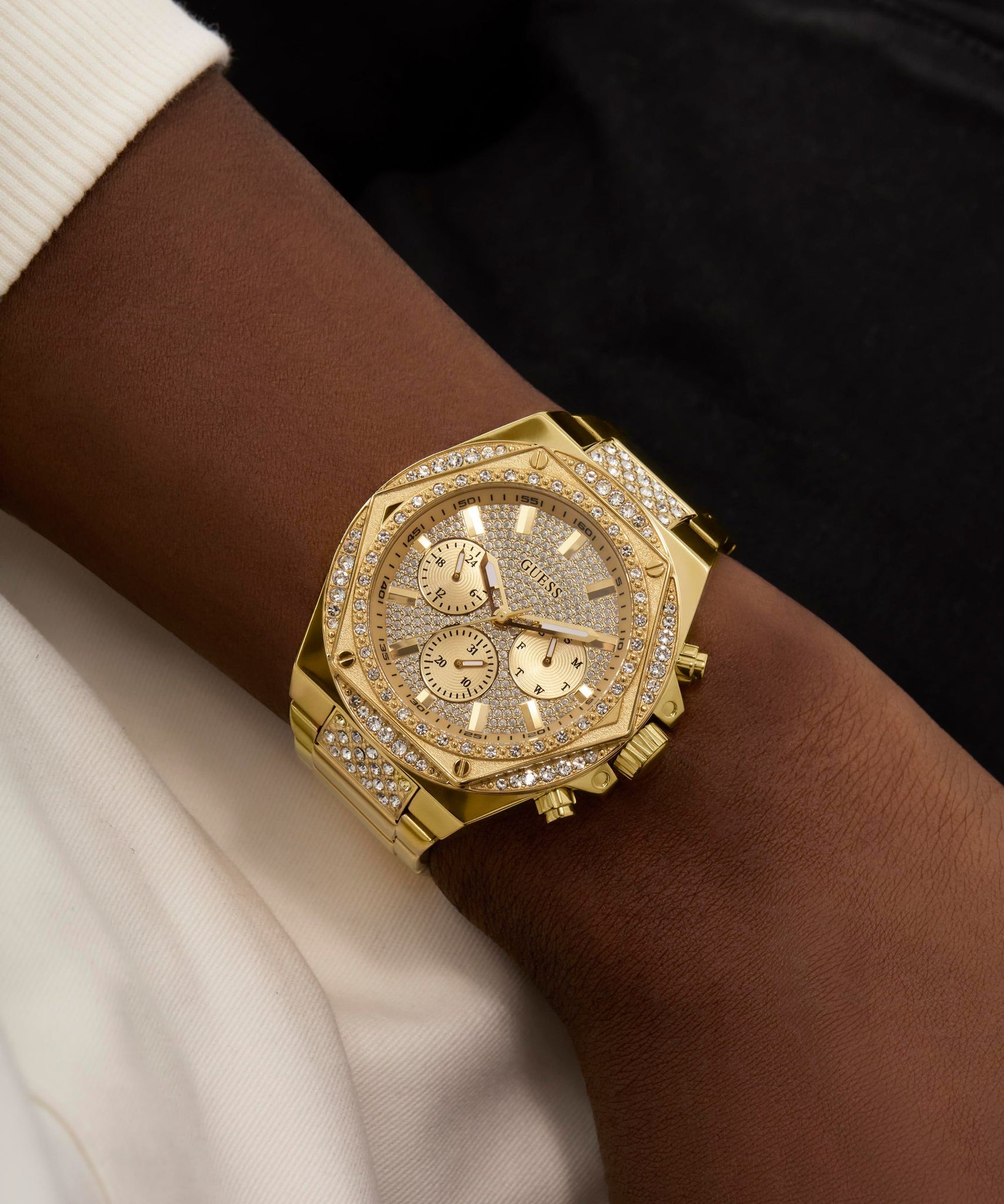 A truly showtopping timepiece with a crystal bezel with angular details, a crystal connection link and a fully glitzed out chrono-look multi-function dial.