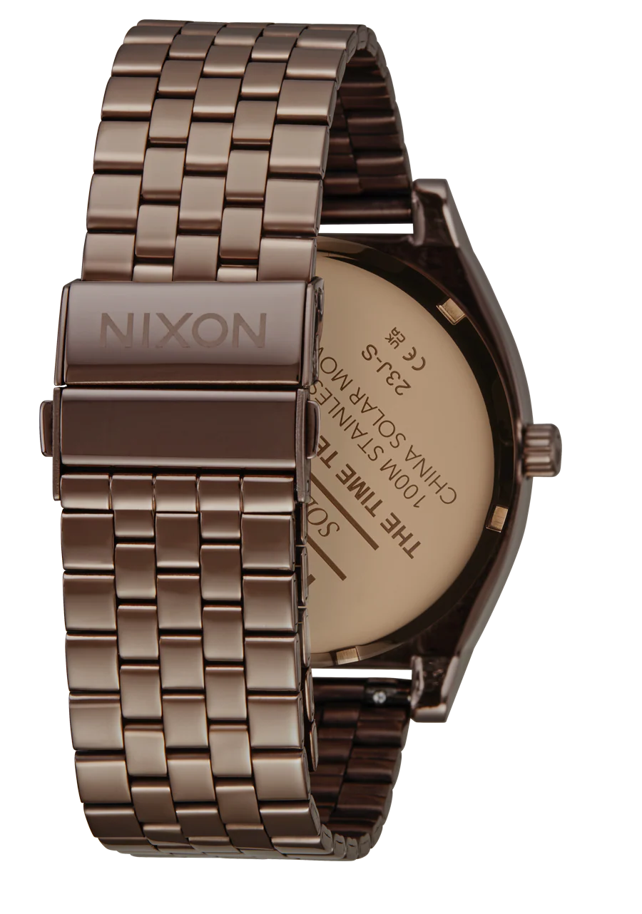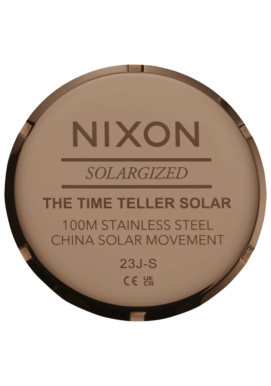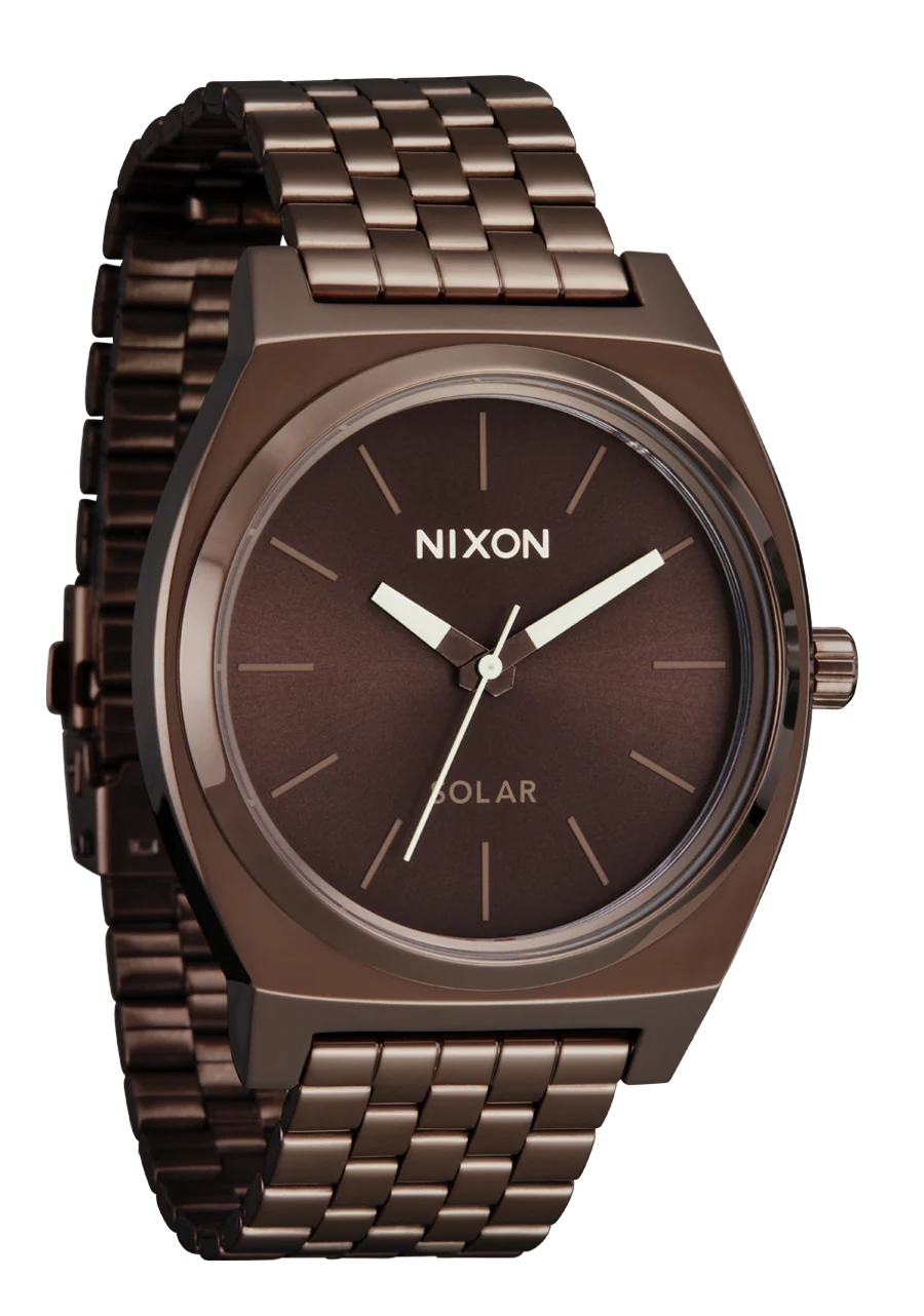 A true Nixon icon just got supercharged. Introducing the new Time Teller Solar. Built with the simple sophistication you know and love, the Time Teller Solar features a bigger case at 40mm, a new quick release 5-link bracelet with a deployment clasp that can be adjusted without a tool, and a 100m / 10 ATM waterproof rating. This watch is ready to make you look and feel good wherever you go.